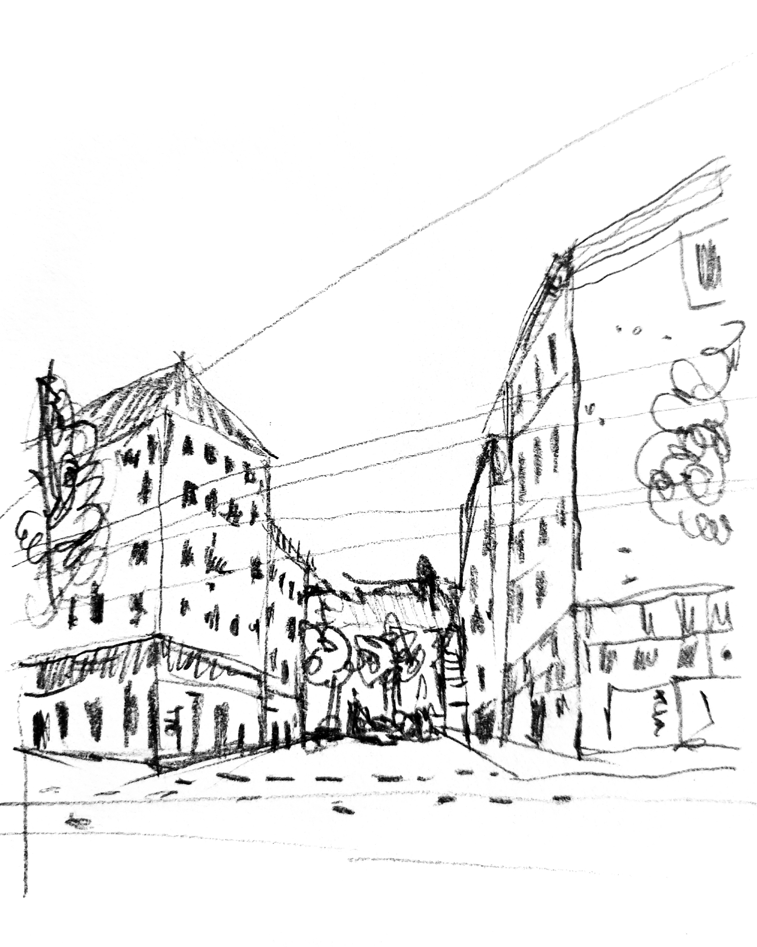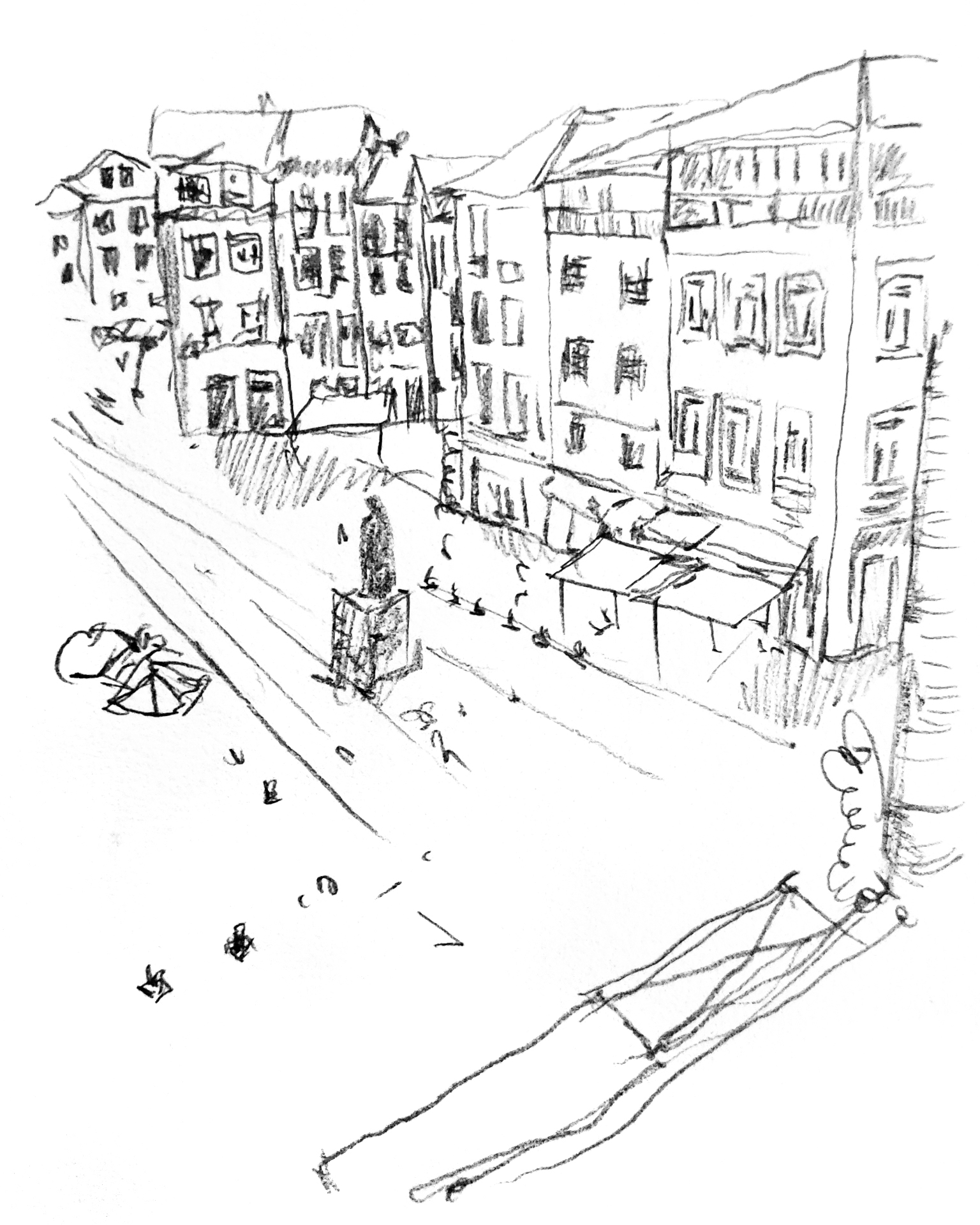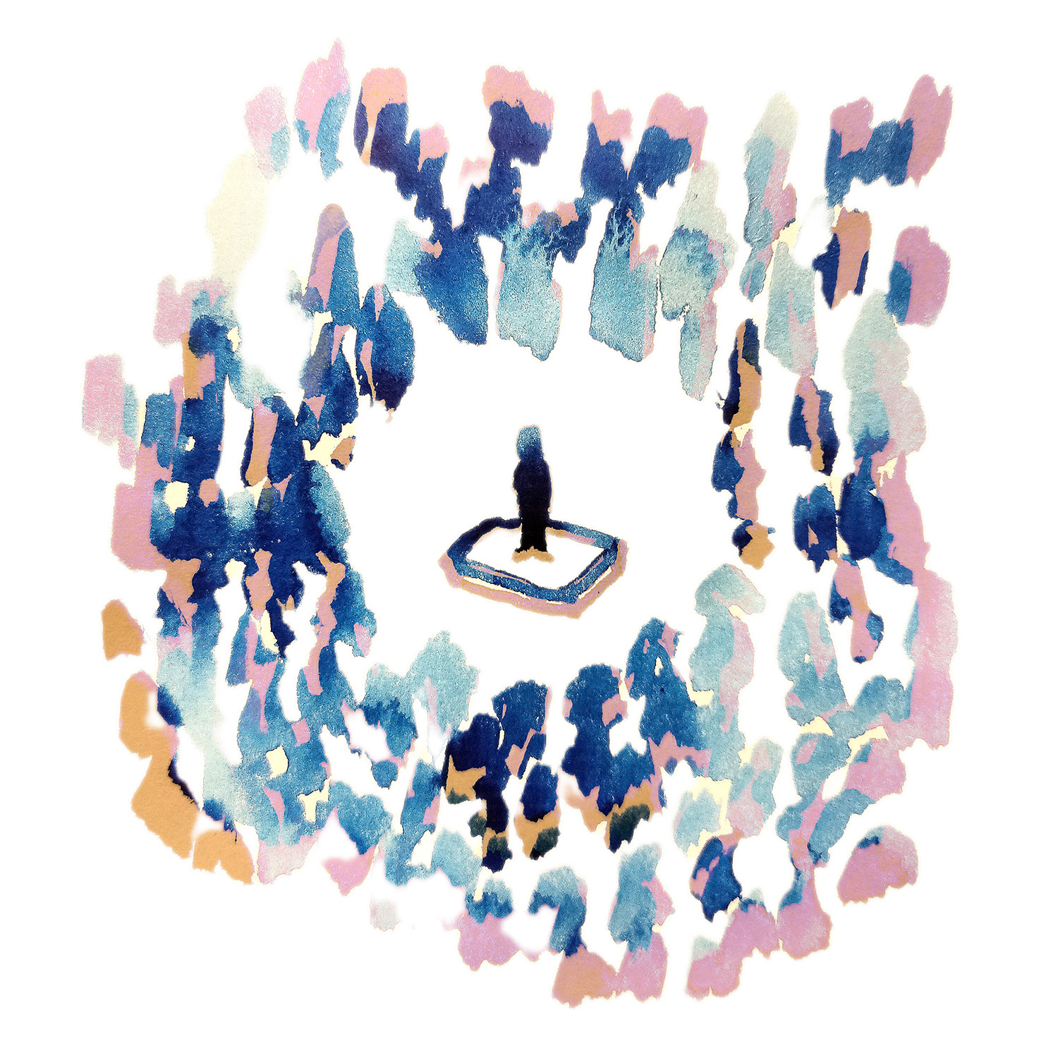Confrontada com o tema “Palco”, comecei por procurar fotografias de produções teatrais, palcos, cenários e expressões faciais tanto dos atores como do público. Daí, desenvolvi uma serie de esboços em aguarela e grafite, explorando diferentes ângulos de visão ao ilustrar a dinâmica que existe entre olhares e os diferentes pontos de fuga de quem está no palco e de quem o observa.